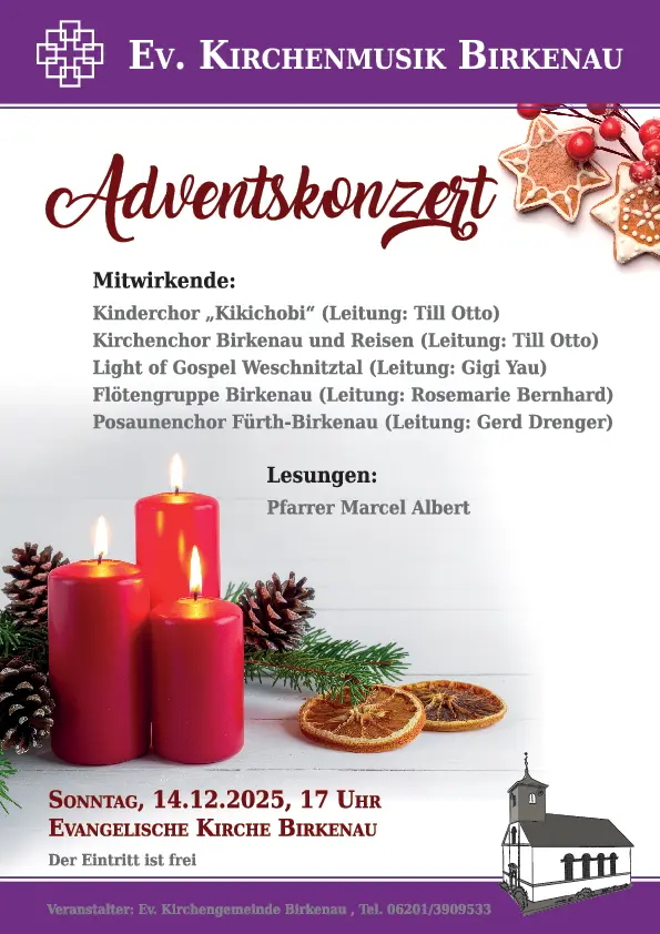 Auch in diesem Jahr laden wir herzlich zum Adventskonzert am 3. Advent um 17 Uhr in der Ev. Kirche Birkenau ein.